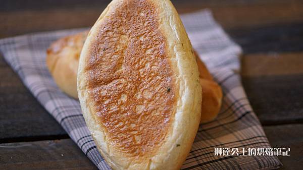 5. 這個麵包烘烤程度剛好的話,接近底部的周圍會有一圈白色,檢查底部應該有上色,放涼後表皮會稍微有點微皺的是正常的,如果整顆麵包都完全上色,外殼又硬,像歐式的硬麵包,那麼可能有點烤過頭了。