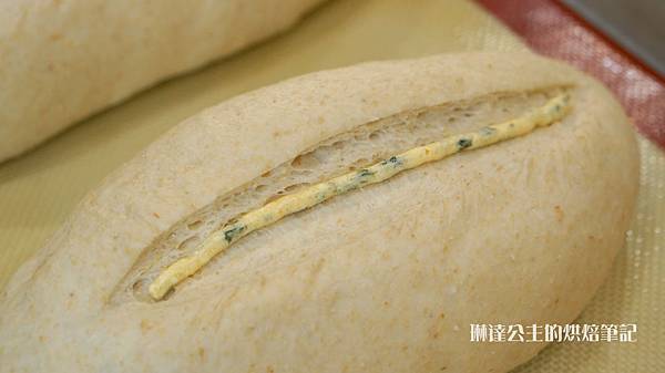 9. 發酵完成的麵團在表面割線,擠上一條細細的香蒜奶油,用205°C(400°F)烤15~18分鐘(烤箱請先預熱)。